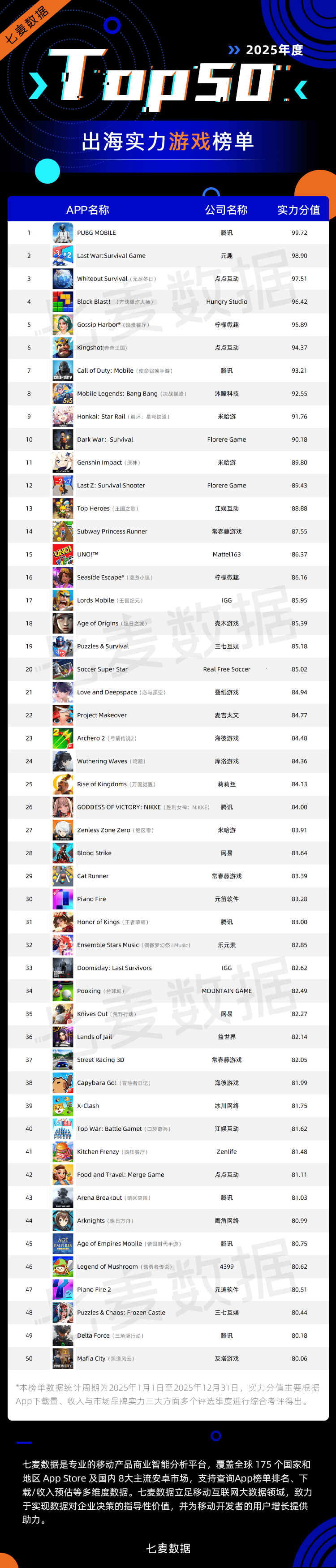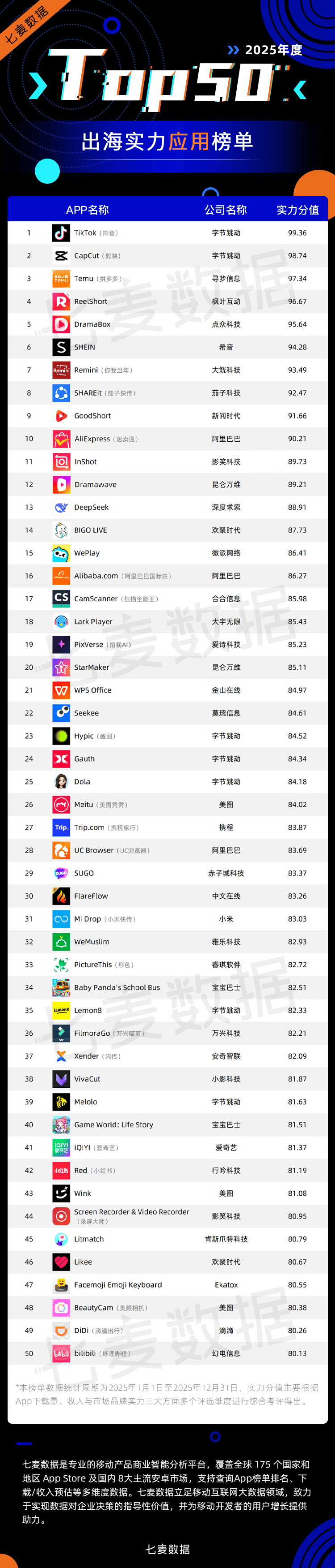 注:实力分值次要按照App下载量、收入取市场品牌实力三风雅面多个评选维度——App下载量和收入、用户好评度、榜单实力、App品牌搜刮热度、社交平台热度等进行分析考评得出。据《2025年中国逛戏出海研究演讲》显示,并正在逛戏、电商、短剧及AI等多个赛道展示出硬核实力。沉磅推出2025年度出海实力榜单,短剧市场持续迸发,